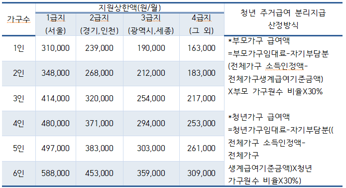 지역별, 가구원수별 기준임대료를 상한으로 실제 임차료를 지급하지만, 자기부담분은 분리된 가구 각각의 가구원 수에 비례해 적용