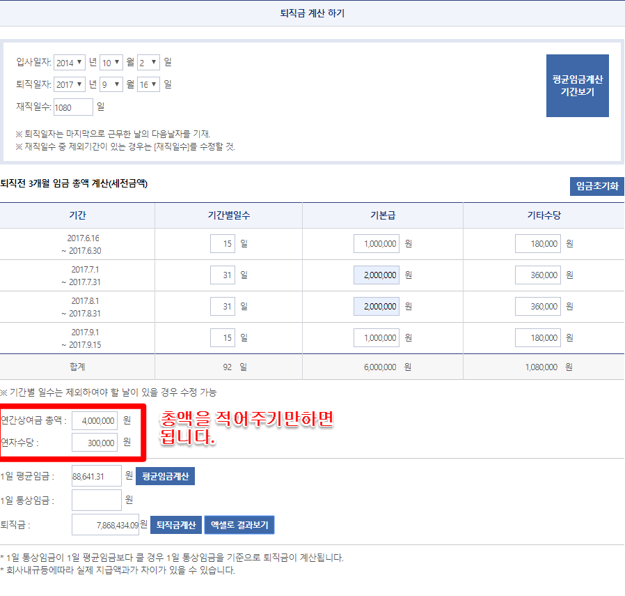자동으로 3개월치만 가산해서 1일평균임금을 계산해 줍니다.