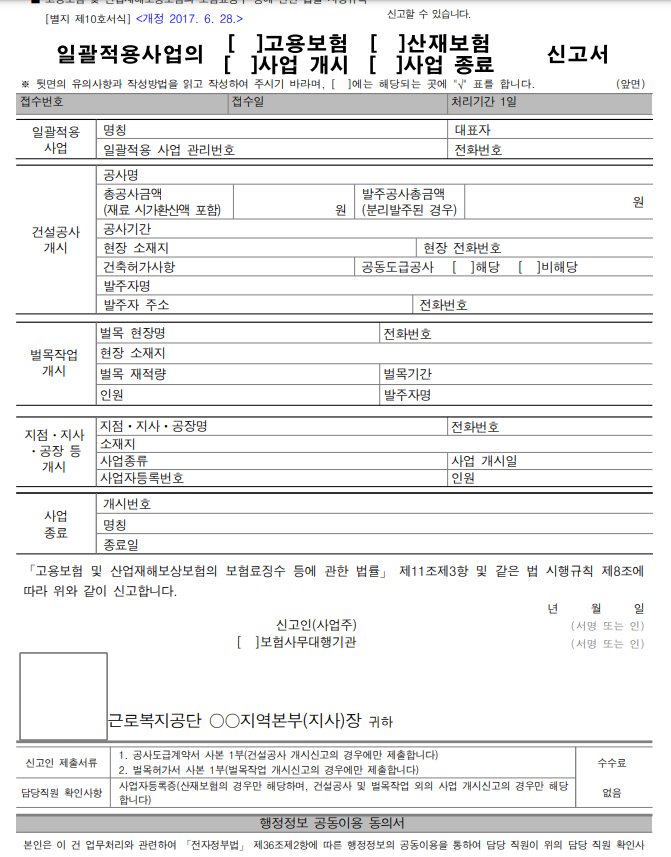 고용 산재 보험 일괄 적용 성립 신고서 사용(인터넷에 서식 검색)